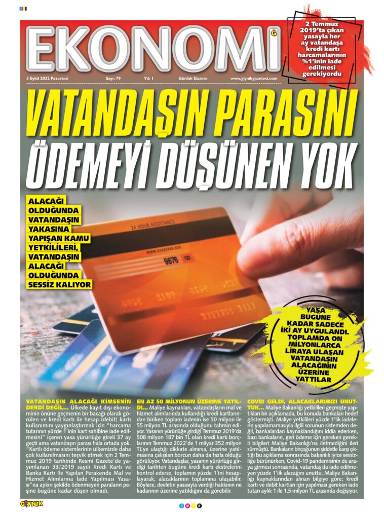 Maliye kaynakları, vatandaşların mal ve hizmet alımlarında kullandığı kredi kartlarından biriken toplam iadenin ise 50 milyon ile 55 milyon TL arasında olduğunu tahmin ediyor. Yasanın yürürlüğe girdiği Temmuz 2019’da 508 milyon 187 bin TL olan kredi kartı borçlarının Temmuz 2022’de 1 milyar 352 milyon TL’ye ulaştığı dikkate alınırsa, üzerine yatılmasına çalışılan borcun daha da fazla olduğu görülüyor. Vatandaşlar, yasanın yürürlüğe girdiği tarihten bugüne kredi kartı ekstrelerini kontrol ederse, toplamın yüzde 1’ini hesaplayarak, alacaklarının toplamına ulaşabilir. Böylece, devletin yasasıyla verdiği hakkının ne kadarının üzerine yatıldığını da görebilir.