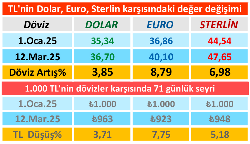 AB-ABD düellosu yanında, Trump’ın Kanada ve Meksika’ya uygulayacağı yeni gümrük vergilerini bir ay ertelemesi, doları etkiledi. Dolarla yakın ilişkili İngiliz Sterlini ile Avustralya Doları ABD Doları karşısında değer kazanırken, Euro da bu fırsatı iyi değerlendirdi. Euro/Dolar son ayın zirvesine ulaştı, dolar Alman harcamaları ve gümrük vergisi ertelemesiyle geriledi. Avrupa Merkez Bankası (ECB) tarafından açıklanan faiz kararı sonrası ise iyice hareketlenen Euro geçen hafta dış piyasalarda %4’ten fazla yükselerek son 16 yılın en iyi haftasını geçirdi. Riske duyarlı sterlin de 4 ayın en yüksek seviyesine yükseldi.
