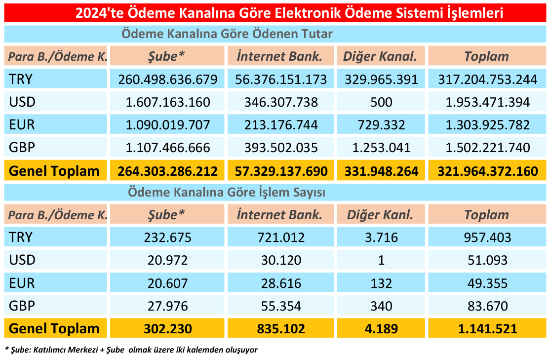 EÖS kapsamında 2024 yılında yapılan işlemlerin %84’ü, para miktarının ise %98,5’i Türk Lirası olarak gerçekleştirildi. Merkez Bankası’nın verilerine göre 947 bin 403 işlemle 317 milyar 204 milyon 753 bin liralık ödeme yapıldı. Diğer üç yabancı para birimiyle yapılan işlemler 184 bin 118 adet, ödeme yapılan miktar ise 4,7 milyar lira civarındaydı. Bu veriler, banka müşterilerinin Türk Lirası ödemelerinde sistemi tercih ettiğine işaret ediyor. EÖS ile yapılan Türk parası işlemlerde 12 bin TL’lik üst limit var. Bu miktara kadar olan işlemler için mobil internet ve ATM’den 6 TL; şubelerden en fazla 24 TL ücret alınıyor. 12 bin TL’nin üzerindeki işlemlerde ise bu ücret 150 ile 600 TL arasında.