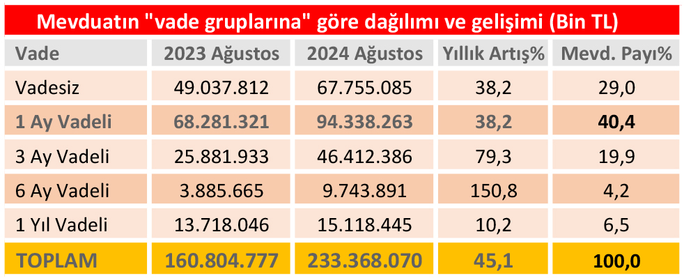 Ağustos 2024 itibarıyla bankalarındaki toplam mevduat 233,3 milyar TL’yi geçti
