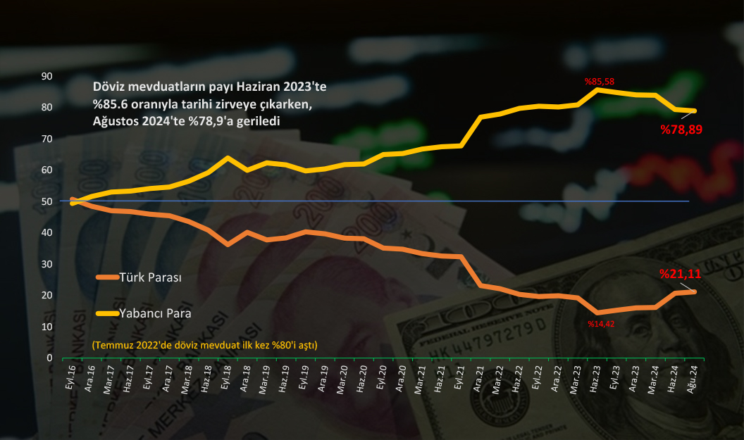 KKTC Merkez Bankası verilerine göre, Eylül 2016’da döviz hesapları ilk kez TL hesaplarını geçerken, o günden bugüne dövizin krallığı sürüyor. Ağustos 2024 itibarıyla bankalardaki mevduat hesaplarındaki toplam paranın %78.89’u döviz cinsi hesaplarda; %21.11’i ise Türk Lirası cinsi hesaplarda tutuluyor. Ağustos sonundaki veriler; mevduatın 184 milyar 099 milyon TL’lik kısmının “Yabancı Para” (döviz) cinsinden, 49 milyar 268 milyon TL’lik kısmının ise “Türk Parası” cinsinden hesaplara yatırıldığını gösteriyor.