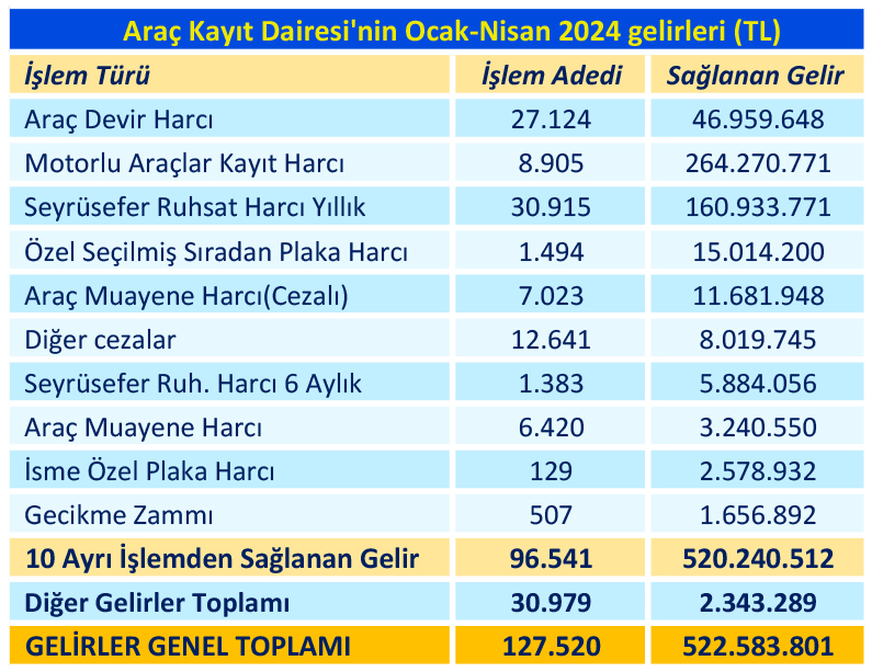 Daire araç kayıt harcından 264 milyon, araç devir harcından 47 Milyon TL sağladı