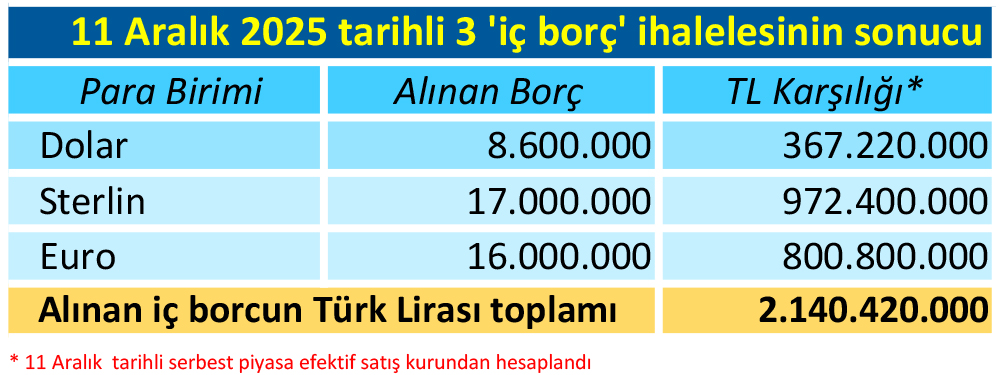 Şubat 2025’ten itibaren ardı ardına borçlanma ihaleleri açılırken, daha önceki “35” ihalede 27,2 milyar liralık borca imza atılmıştı. Bakanlar Kurulu’nun koyduğu 6 milyarlık barajın yaklaşık 5 kat aşılmasını da beraberinde getiren dünkü ihalelerde iç borç yüküne; “8 milyon 600 bin dolar” (366 milyon 790 bin TL) “16 milyon sterlin” (800 milyon 800 bin TL) ve “17 milyon Euro” (972 milyon 400 bin TL) daha eklendi. Yeni borçlanmalarla iç borç stoku dolarda 110,4 milyon düzeyine; Sterlinde 76,4 milyon düzeyine, Euro’da 51,3 milyon düzeyine çıktı. Türk Lirası’ndaki borç stoku 4,9 milyar lira seviyesinde saptandı.