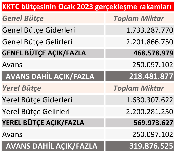 KKTC Maliye Bakanlığı verilerine göre Ocak 2023’te bütçe ciddi miktarda “fazla” verdi. Veriler, Ocak ayında yerel bütçede 319 milyon 876 bin TL, genel bütçe ise 218 milyon 481 bin TL fazlaya işaret ediyor. Finans çevreleri “Maliye Bakanı’nın endişelerine” rağmen 2023’e “dinamik” bir başlangıç yapıldığını belirterek, devletin gelirlerindeki ciddi artışın “pahalılık” ve “astronomik oranda yükseltilen (dolaylı) vergilerden” kaynaklandığına dikkati çekiyor. Maliye Bakanı Alişan Şan, geçtiğimiz günlerde yaptığı bir açıklamada, “Türkiye’den kaynak gelmemesi halinde 2023 Mali yılı bütçe açığının 8 milyar civarında olabileceğini” söylemişti.