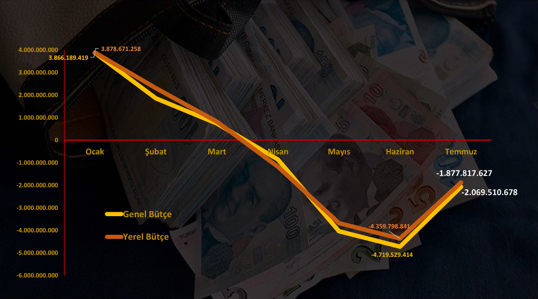 Verilere göre; Haziran ayında 1 milyar 881 milyon TL olarak kayıtlara geçen “gelir vergisi” gelirleri Temmuz’da %187 artışla 5 milyar 372 milyon liraya uçtu. Gelir vergisindeki yaklaşık 3,5 milyar liralık ani çıkış yanında, katma değer vergisi ile harç gelirlerinde de dikkat çekici artışlar yaşandı. Bütçedeki giderler kalemi incelendiği zaman giderlerin 17,8 milyar TL’sinin personel giderleri; 26,4 milyar TL’sinin ise cari transferler olduğu dikkati çekiyor. 3,8 milyarlık savunma giderleri de üçüncü büyük ana harcama kaynağı olarak görülüyor.