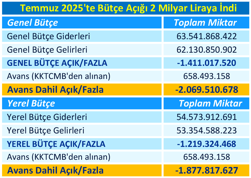 KKTC Maliye Bakanlığı verilerine göre geçtiğimiz Temmuz ayında bütçe açığı yaklaşık 2,5 milyar lira (%57) geriledi. Haziran ayında genel bütçede 4,7 milyar liradan, yerel bütçede ise 4,3 milyar liradan fazla olan açık; Temmuz ayında ciddi oranda gerileyerek genel bütçede 2 milyar 069 milyona, genel bütçede de 1 milyar 877 milyon TL’ye indi. Finans çevreleri, Temmuz ayında maaş ve ücretlere yapılan %17.79 oranındaki artışlar ile asgari ücrete gelen artışların Hazine’ye giden “gelir vergisine” fazlasıyla yaradığını vurgularken, TC Yardım ve Kredileri kalemindeki sert artışa da işaret ediyor.