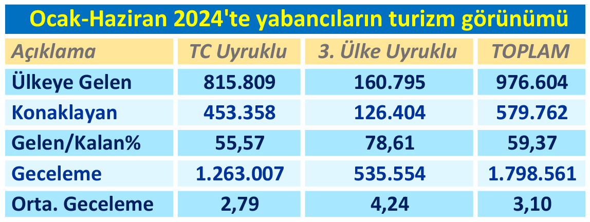 Kuzey Kıbrıs’ı Ocak-Haziran 2024 döneminde ziyaret eden toplam 976 bin 604 yabancı uyruklunun %40.63’ü ülkeye turizm amacıyla gelmedi. Bu oran 2023’ün aynı döneminde %38.2; 2022’de %31.8 idi. “Turist olarak gelmeyen yabancıların” hem sayısal hem de oransal açıdan hızlı bir yükselişte olduğu dikkati çekti. İlk 6 ayda, “Kendi alternatifleri ve statüleri kapsamında” ülkede konaklayan kişi sayısı 396 bin 842; otellerde kalanların sayısı ise 579 bin 762 kişi düzeyinde saptandı. Ülkeye hava ve deniz yoluyla gelen yabancıların 815 bin 809’unu Türkiye Cumhuriyeti uyruklular, 160 bin 795’ini ise 3’üncü ülke uyruklular oluşturdu.