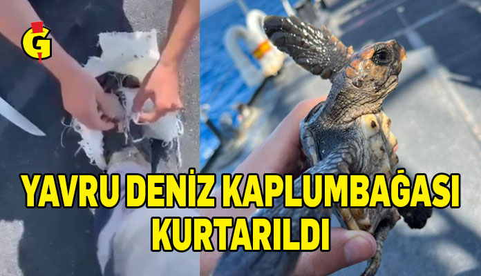 GKK’dan verilen bilgiye göre, yavru kaplumbağa deniz içerisinden bota alınarak yardım edildi.