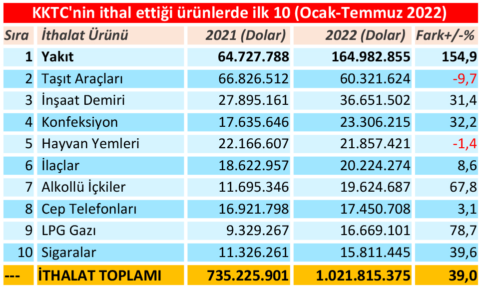 KKTC’nin 2022 yılı Ocak-Temmuz döneminde gerçekleşen toplam ithalatının 706,8 milyon dolarlık kısmı (%69,2’si) Türkiye’den yapıldı.