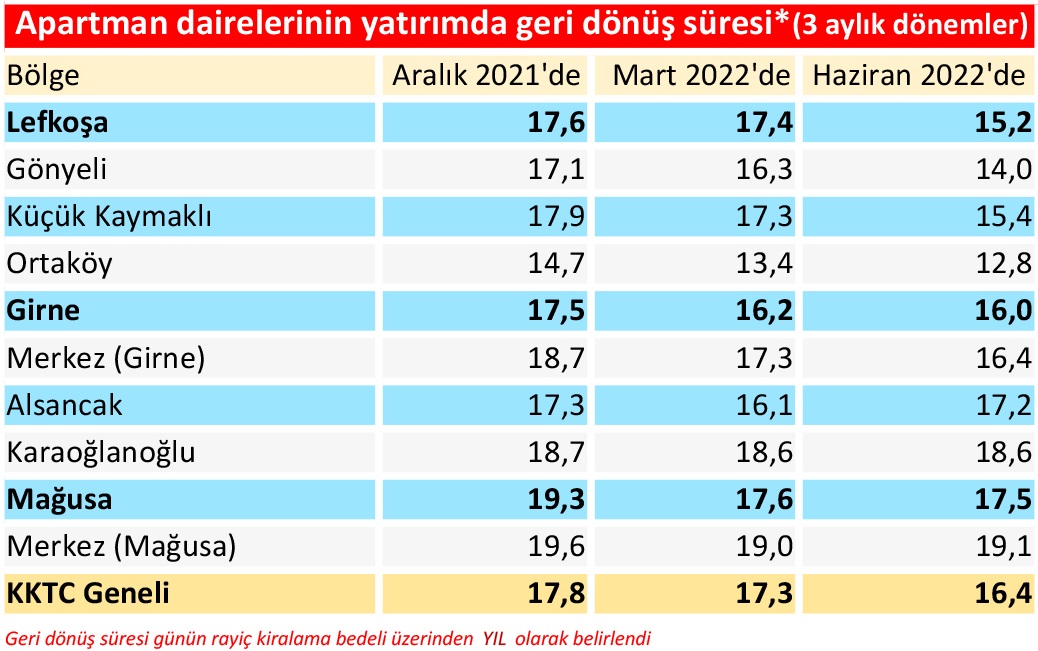 Apartman dairelerinin geri dönüş süresi en kısa olan ilçe ortalama 15,2 yılla Lefkoşa olurken, Girne’nin geri dönüş süresi ortalama 16,0 yıl, Mağusa’nın geri dönüş süresi de ortalama 17,5 yıl düzeyinde hesaplandı. Lefkoşa, Mağusa ve Girne ilçelerinin semtlere göre en kısa geri dönüş süresi hala Lefkoşa’ya bağlı Ortaköy semti. Ortaköy’de alınan bir dairenin geri dönüş süresi 12,8 yıla kadar indi. Gönyeli 14,0 yılla ikinci, Küçük Kaymaklı da 15,4 yılla üçüncü sırada yer aldı. Ülke çapında semtlere göre en uzun geri dönüş süresi olan yer ise 19,1 yılla hala Mağusa Merkez. Bu semti 18,6 yılla Karaoğlanoğlu ile 17,2 yılla Alsancak takip etti.