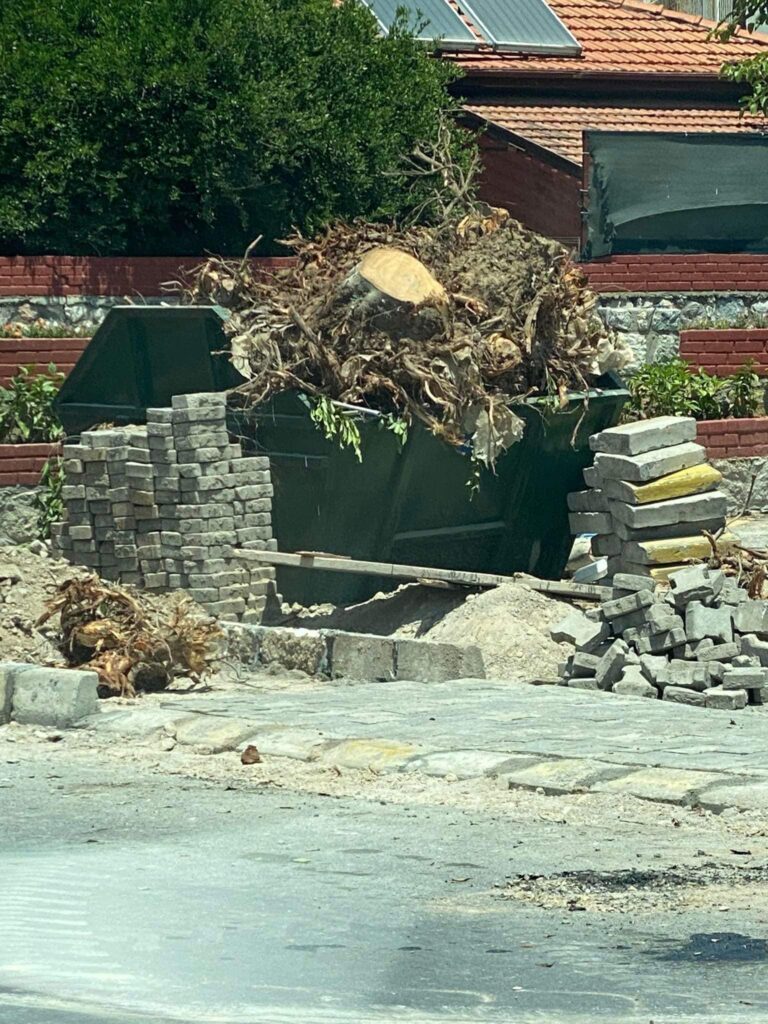 Bugün de belli ki Girne Yeni Liman Çemberi’nde bulunan dükkanın önündeki “7 AĞAÇ” birilerine batmış (!), artık ihtiyaçları olmadığını düşünmüşler (!) ve bir eşya gibi kesip söktükleri ağaçları konteynerlere atmışlar!!!