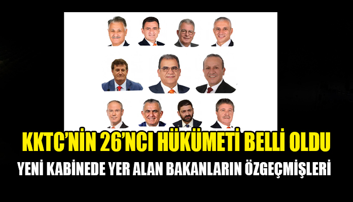 Başbakan Faiz Sucuoğlu, KKTC’nin 26’ncı hükümeti olan UBP-DP-YDP koalisyon hükümetinin kabinesini Cumhurbaşkanı Ersin Tatar’a sundu. Buna göre yeni kabinede Başbakan Faiz Sucuoğlu (UBP), Ekonomi ve Enerji Bakanı Kutlu Evren (UBP), Başbakan Yardımcısı, Turizm ve Çevre Bakanı Fikri Ataoğlu (DP), Dışişleri Bakanı Hasan Taçoy (UBP), Maliye Bakanı Sunat Atun (UBP), İçişleri Bakanı Ünal Üstel (UBP), Bayındırlık ve Ulaştırma Bakanı Erhan Arıklı (YDP), Milli Eğitim ve Kültür Bakanı Nazım Çavuşoğlu (UBP), Tarım ve Doğal Kaynaklar Bakanı Dursun Oğuz (UBP), Sağlık Bakanı Ali Pilli (UBP), Çalışma ve Sosyal Güvenlik Bakanı Oğuzhan Hasipoğlu (UBP) oldu.