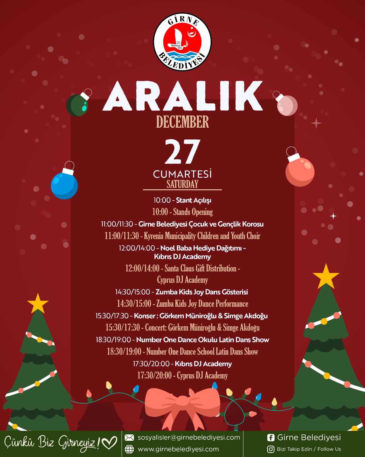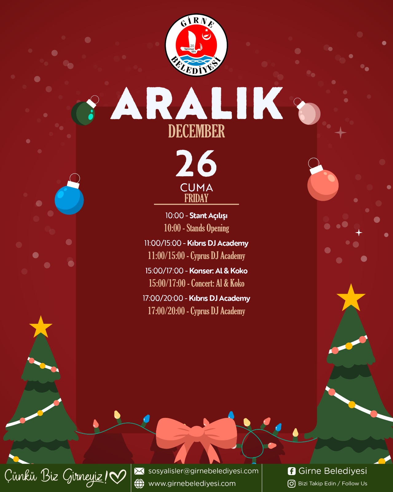 Girne Belediyesi tarafından düzenlenen Yeni Yıl Pazarı, 26–27–28 Aralık tarihlerinde Bellapais Köy Meydanı’nda ziyaretçilerini ağırlamaya hazırlanıyor. Cuma, Cumartesi ve Pazar günleri gerçekleşecek etkinlikte, yeni yıl ruhunu yansıtan renkli stantlar, eğlenceli aktiviteler ve alışveriş olanakları bir araya gelecek.