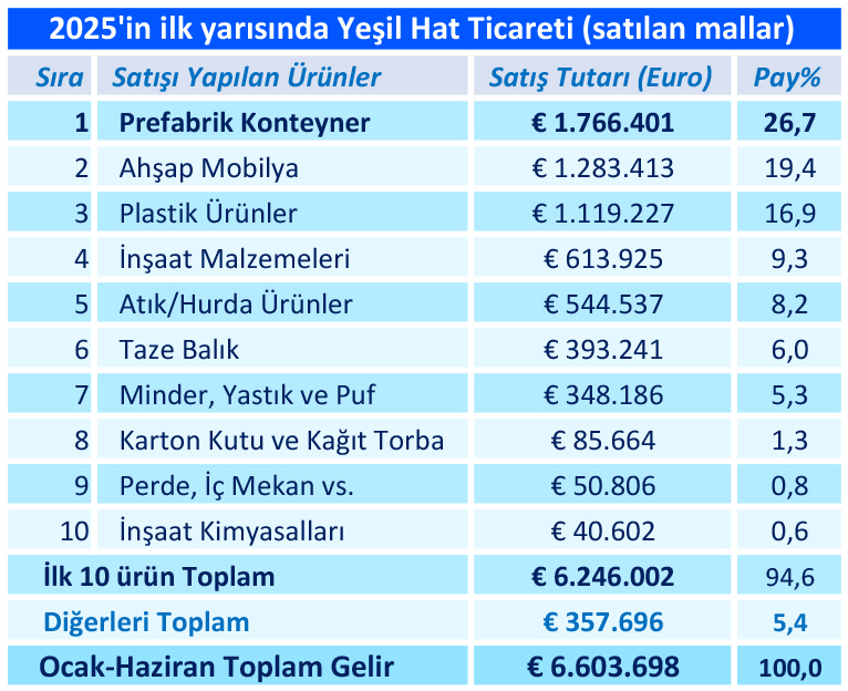 Kuzey Kıbrıs’tan Güney Kıbrıs’a yönelik ticarette “prefabrik konteyner” satışı Ocak-Haziran 2025 döneminde de ilk sırada yer aldı. Ticaret Odası verilerine göre, prefabrik konteyner satışları, bir önceki yıla kıyasla yüzde 14.1 oranında artarak, 1 milyon 549 bin Euro’dan 1 milyon 766 bin Euro’ya tırmandı. İkinci sırada 1 milyon 283 bin Euroluk satışla “Ahşap mobilyalar”; üçüncü sırada 1 milyon 119 bin Euroluk satışla “Plastik ürünler”; dördüncü sırada ise 613 bin Euroluk satışla “İnşaat malzemeleri” var. Bu malları “Atık ve hurda ürünler” (545 bin Euro); “Taze balık” (393 bin Euro); Minder, yastık ve puf” (348 bin Euro) takip ediyor. Geriye kalan ürünlerden sağlanan gelir ise 254 bin Euro civarında oldu.