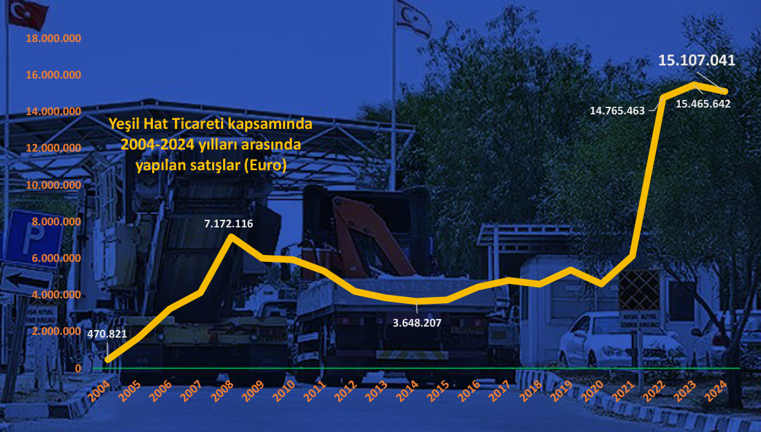 Yeşil Hat Tüzüğü kapsamında Kuzey Kıbrıs’tan Güney Kıbrıs’a yönelik mal satışında 2022 yılında sağlanan ilerleme, 2023’ten sonra 2024’te de devam etti. Kıbrıs Türk Ticaret Odası’nın açıkladığı rakamlara göre, 2024 yılında Yeşil Hat Ticareti kapsamında Güney Kıbrıs’a 15 milyon 107 bin 041 Euro tutarında satış yapıldı. Rakamlara göre Yeşil Hat Ticareti 2022 yılında %141.2 oranında artışla 14 milyon 765 bin 463 Euro seviyesine; 2023 yılında ise %4.7 artışla 15 milyon 466 bin Euro seviyesine çıkmıştı. 2024’teki satışlar yüzde 2.3 düşüşe rağmen, 15 milyon Euro sınırının üzerinde kaldı, bu miktar ise ticaretin en yüksek ikinci rakamı oldu.