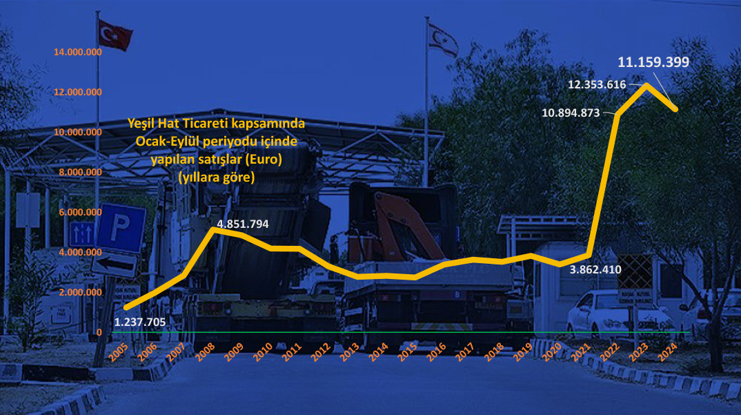 Yeşil Hat Tüzüğü kapsamında Kuzey Kıbrıs’tan Güney Kıbrıs’a yönelik mal satışında son üç yıldır işler yolunda gidiyor. Kıbrıs Türk Ticaret Odası’nın açıkladığı rakamlara göre Yeşil Hat Ticareti 2022 yılında sert artışla dikkati çekerken, 2023’te rekor düzeye çıkmıştı. 2024 yılında da yüksek satış rakamları yılın ilk yarısında da sürerken, ikinci yarısında geçen yıla kıyasla hafif düşüş görüldü. Ancak, Ocak-Eylül periyodundaki satış miktarı, tüm zamanların en yüksek ikinci rakamı oldu.
