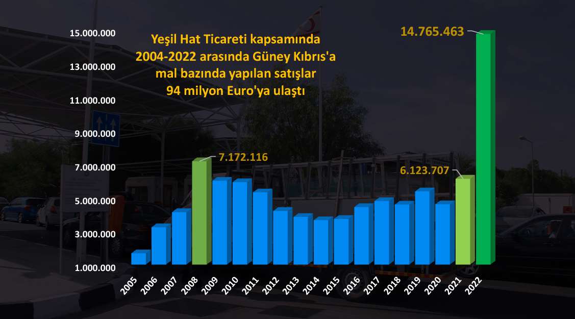 18 YIL 5 AYDA 122,8 MİLYON EURO… Yeşil Hat Tüzüğü (EC866/2004) kapsamında 2004’ün Ağustos ayı içinde 3 bin 847 Euro ile başlayan ticarette 2022 sonu itibarıyla 122 milyon 820 bin 421 Euro’luk satış rakamına ulaşıldı. Ticaret Odası’nın verilerine göre, 18,5 yıllık sürede Güney Kıbrıs’a toplam 93 milyon 979 bin 830 Euro’luk mal satışı yapıldı. Temmuz 2011 ile Mart 2012 arasındaki dokuz aylık sürede gerçekleştirilen 28 milyon 840 bin 592 Euro’luk elektrik satışı da eklenince, Güney Kıbrıs’a yönelik ticarette sağlanan gelir 122 milyon Euro’yu geçiyor.