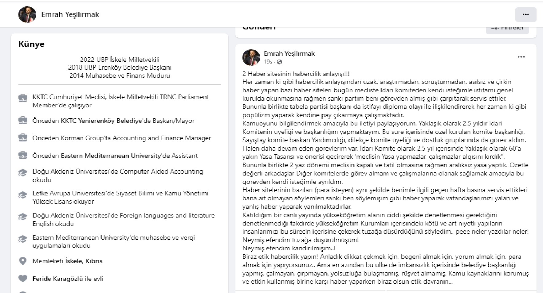 Sosyal medya hesabında yazdığı uzun açıklamasında, Yeşilçam filmlerinde geçen replikleri aratmayacak şekilde, “görevden alınmadım, ben istifa ettim” diyen Emrah Yeşilırmak, “görevden alındığını” yazan medya kuruluşları için kanıtlayamayacağı “çirkin iddialar” ortaya attı. Yeşilırmak, kısa bir süre önce partisi UBP ile hükümet ortağı olan bir parti için ise “tabela partisi” ifadesini kullanacak kadar ileri gitti. Ayrıca, yerel yönetimlerde görev yaparken “ne kadar dürüst” olduğu konusunda kendine de methiyeler düzdü.
