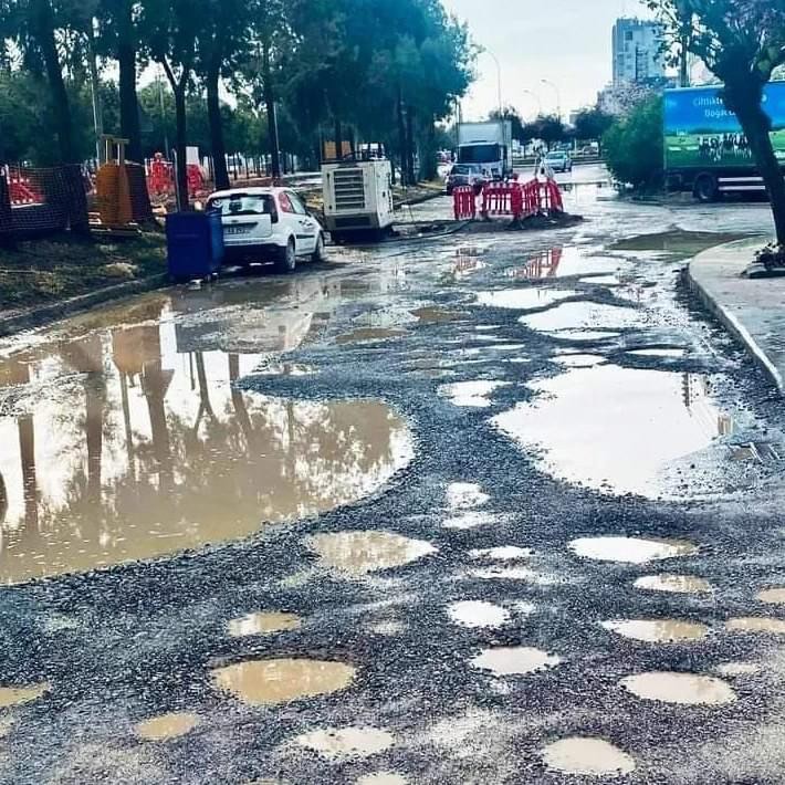 Gördüğünüz manzara ve bunların çok daha kötüsü Mağusa’nın %80’ini kaplamış durumda. Buna bir de yağmurlu havaları eklersek, enkaz görünümlü,adeta savaştan çıkmış gibi bir durum meydana geliyor kentin her sokağında,her caddesinde durum bu.. .. Bırakın araç kullanmayı Mağusa’da yürüyüş bile yapılmıyor, adım atmak kabus gibi bir şey oldu.