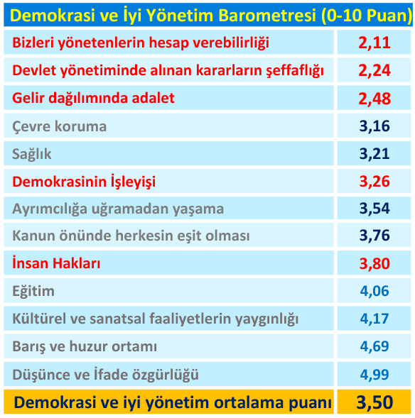 Demokrasilerde olması beklenen ve dünyada kullanılan birçok demokrasi endeksinde bulunan başlıklar dikkate alınarak düzenlenen ‘Demokrasi ve İyi Yönetim Barometresi’nde vatandaş ayrımcılığa uğradığını 3.54 puan ile açık bir şekilde ortaya koydu. Geriye kalan diğer başlıkların aldığı puanlar ise şöyle: Çevre koruma 3.16; Sağlık 3.21; Kanun önünde herkesin eşit olması 3.76; İnsan Hakları 3.8; Eğitim 4.06; Kültürel ve sanatsal faaliyetlerin yaygınlığı 4.17; Barış ve huzur ortamı 4.69; Düşünce ve İfade özgürlüğü 4.99.