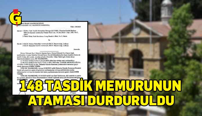 Seçim yasakları öncesinde yapılan 148 tasdik memuru ataması, Kıbrıs Türk Tasdik Memurları Derneği’nin (KTTMD) başvurusu üzerine Yüksek İdare Mahkemesi kararıyla durduruldu.