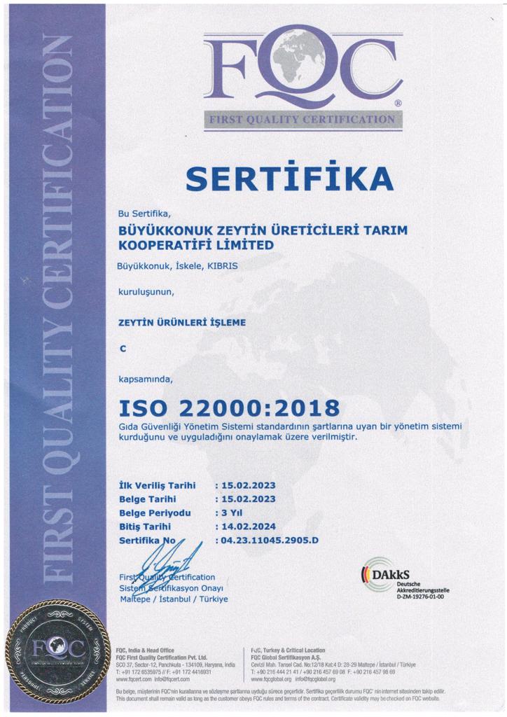 Tüm bu çalışmaların yanısıra, alımı yapılan makine ve ekipmanlarının muhafaza edildiği Zeytin Koop tesisleri için gerekli çalışmalar yürütüldü, denetimden geçirildi ve ISO 22000 Gıda Güvenliği Yönetim Sistemi sertifikasını almaya hak kazanıldı.
