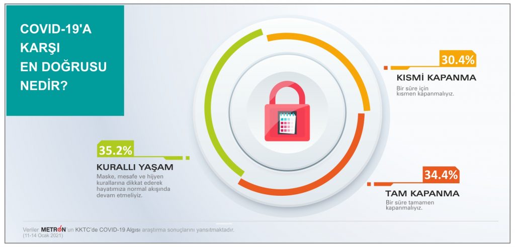 Açıklanan verilere göre halkın yüzde 34.4’ü mevcut durumda tamamen kapanmak gerektiğini düşünüyor. Kısmen kapanma diyenlerin oranı yüzde 30.4. Maske, mesafe ve hijyen kurallarına dikkat edilerek hayata normal akışında devam edilmesini savunanların oranı ise yüzde 35.2.