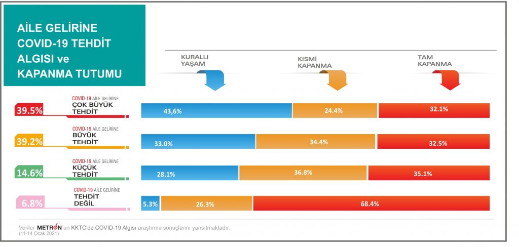 Salgının finansal durumunu ve aile gelirini büyük bir tehdit altına aldığını düşünenlerin büyük çoğunluğu kapanmaya karşı çıkarken (Yüzde 43.6), gelirinin risk altında olmadığını düşünenlerin çok büyük bir kısmı tamamen kapanmayı savunuyor (Yüzde 68.4).